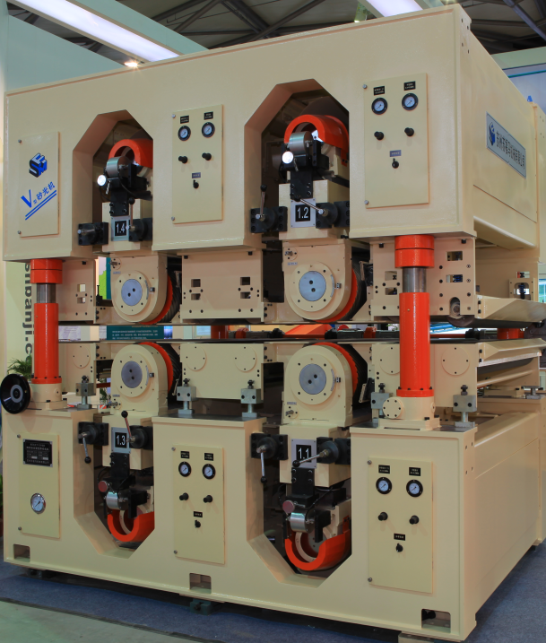 4. 优化砂架驱动方式和功率配置,提高传动效率,降低砂光能耗10%,降低砂带消耗16%。适宜的接触辊直径和壁厚比、特殊设计的无间隙接触辊偏心装置和高标准动平衡精度(≤1g)。大直径耐磨粗砂辊,辊径可达ф450mm,提高加工能力和辊筒钢性。
