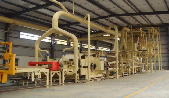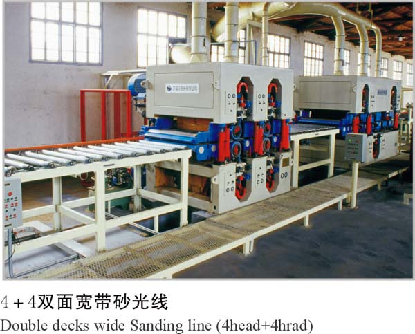 毛板在砂光前先堆垛贮存一段时间,使胶进一步固化以及板的含水率与大气的相对含水率趋于平衡,达到板的稳定性和增加板的强度。毛板由叉车送入进料辊台,经砂光机砂光后分等、堆垛、包装入库。