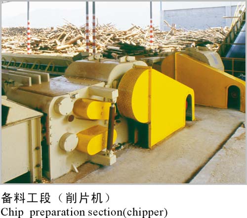 原料经过削片机切削成一定规格的木片至料仓贮存,经过筛选将木片中的细屑、泥土及砂石等杂质清除。