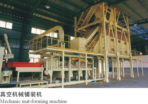 干燥过的纤维由风送系统送入真空机械铺装机,通过抛料辊及铺装头抛洒,均匀落在成型网带上,网带下的真空箱可调节负压使成型板坯密度更加均匀。蓬松的板坯经预压机预压密实后,经板坯纵、横截锯制成符合规格长度的板坯,然后经锯边运输机、加速皮带运输机、贮板运输机、伸缩式运输机等连续运输后送至装板机,装板机逐层装完板坯后,装板机内的小车将悬臂传送带连同板坯一道进入热压机,在送进过程中传送带前端的铲头将已压好的纤维板同时推出去,当小车到达终点时,纤维板已全部进入卸板机,而板坯也到达预定位置,此时小车后退,同时皮带向前运转,在传送带的线速度与小车后退速度相等时,板坯处于相对静止,从而被留在热压板上。板坯在热压机的温度和压力作用下,压制成规定的厚度,并使内部胶粘剂固化,从而制成具有一定强度的板材。压制后由卸板机将其成板卸至托架,在吊笼逐层下降时由出板机构逐块卸出,运至下一工序。热压后的毛板经过冷却翻板机自然冷却后由纵横锯边机、横向锯边机锯边后堆垛。